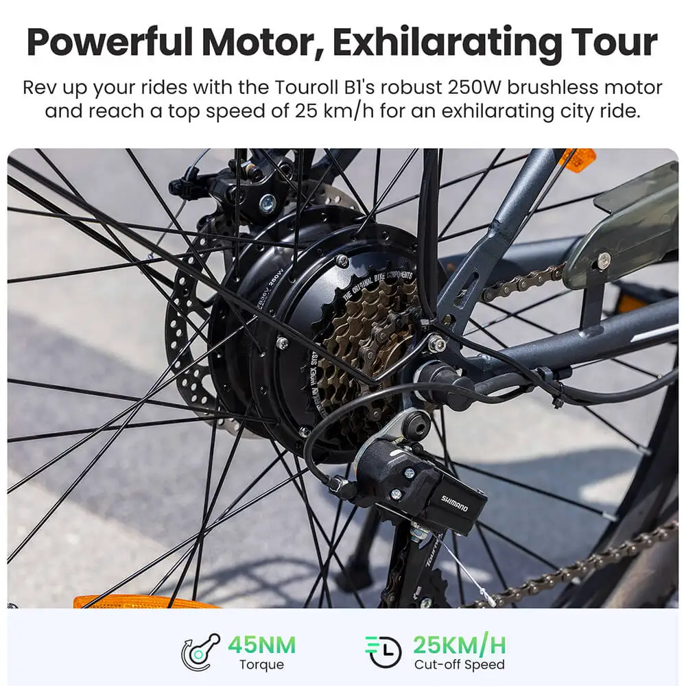 Touroll B1 este bicicleta electrică perfectă pentru navetă, oraș, plimbări lungi și utilizatori care caută confort, autonomie mare și stabilitate. Motorul brushless de 250W cu 45 Nm oferă o accelerare lină, ideală pentru pante moderate și deplasări urbane.