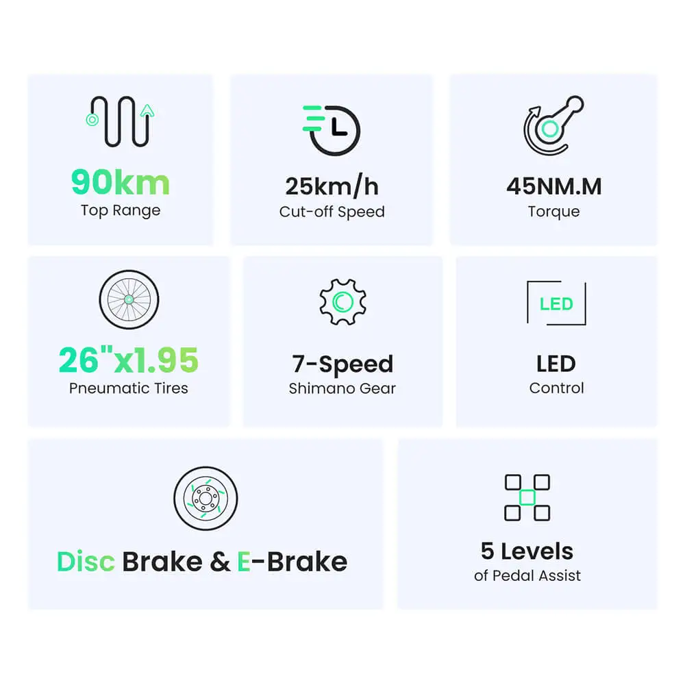 Autonomia ajunge până la 90 km în modul asistat, în funcție de greutate, temperatură și nivelul de asistare.