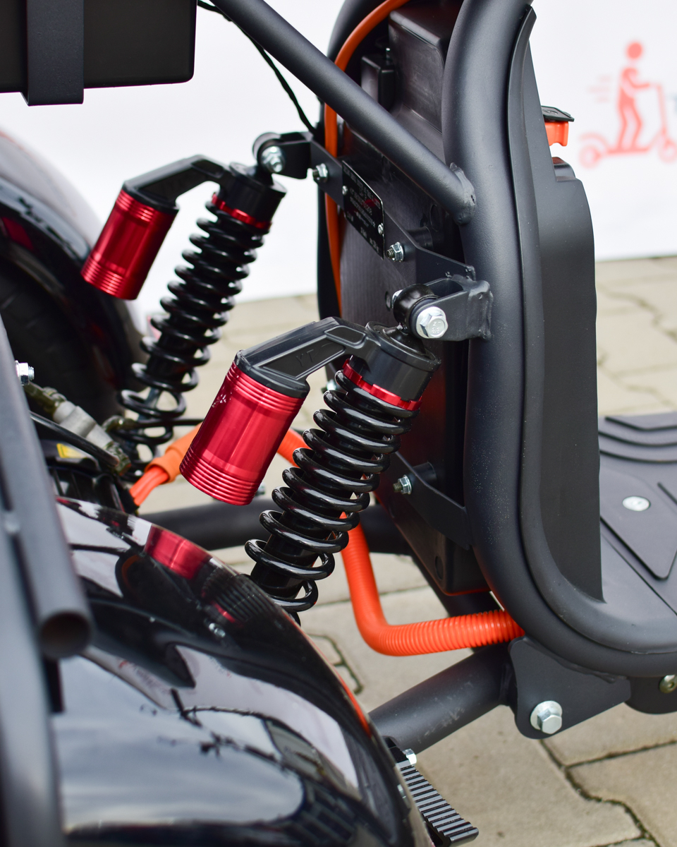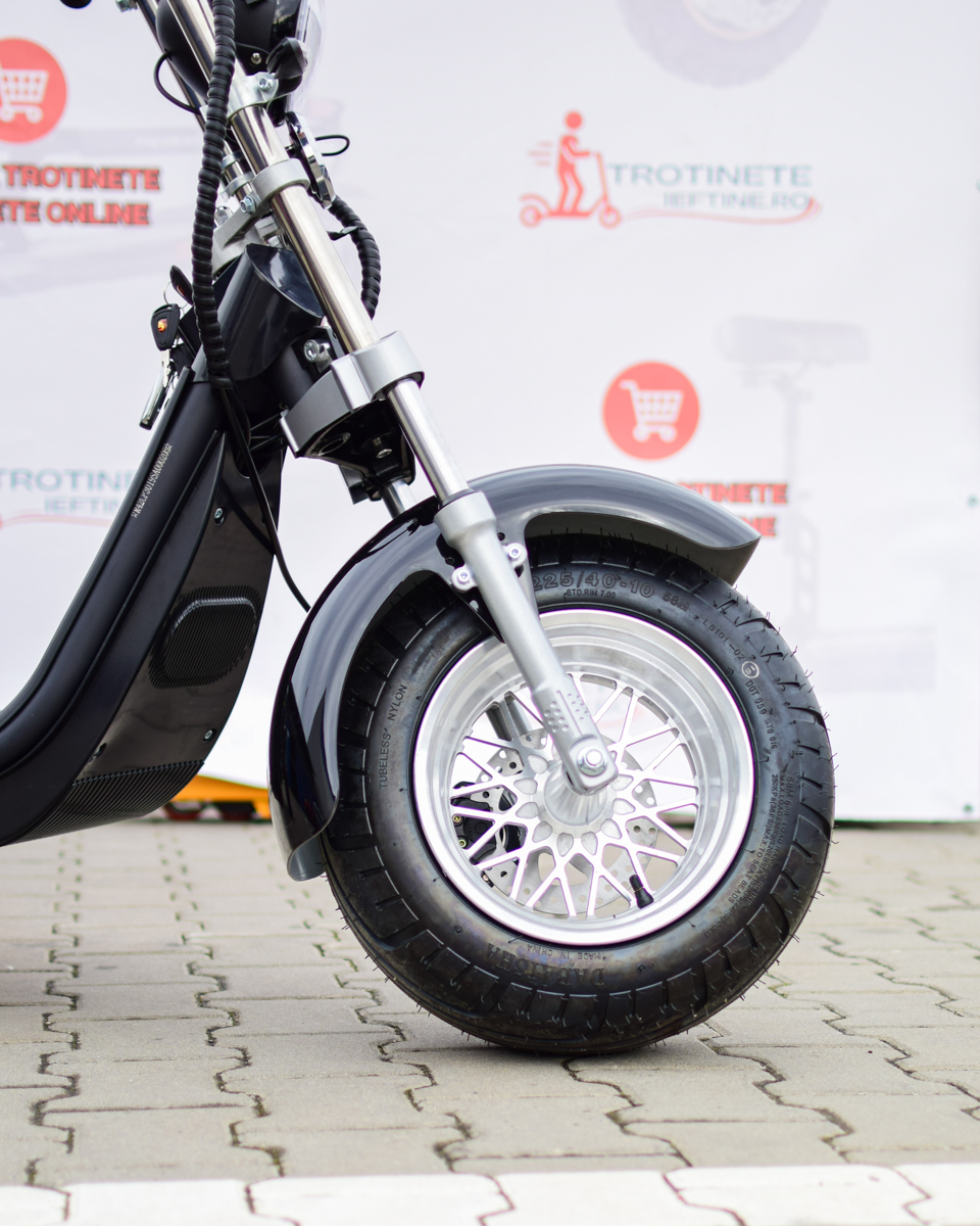 Acest scuter electric este conceput pentru cei care își doresc stabilitate, autonomie mare și un design modern, tip Harley. Este ideal pentru oraș, dar și pentru plimbări mai lungi, datorită bateriei de mare capacitate și confortului oferit de șa pentru două persoane.