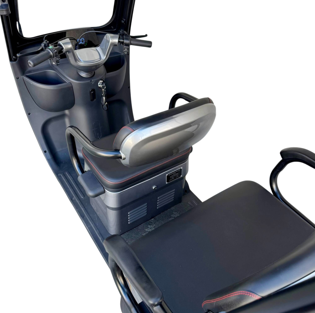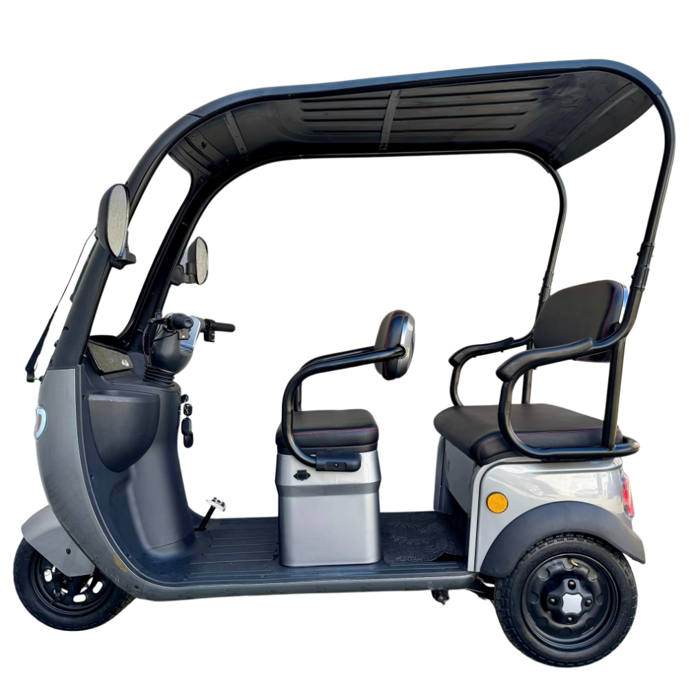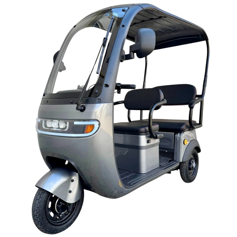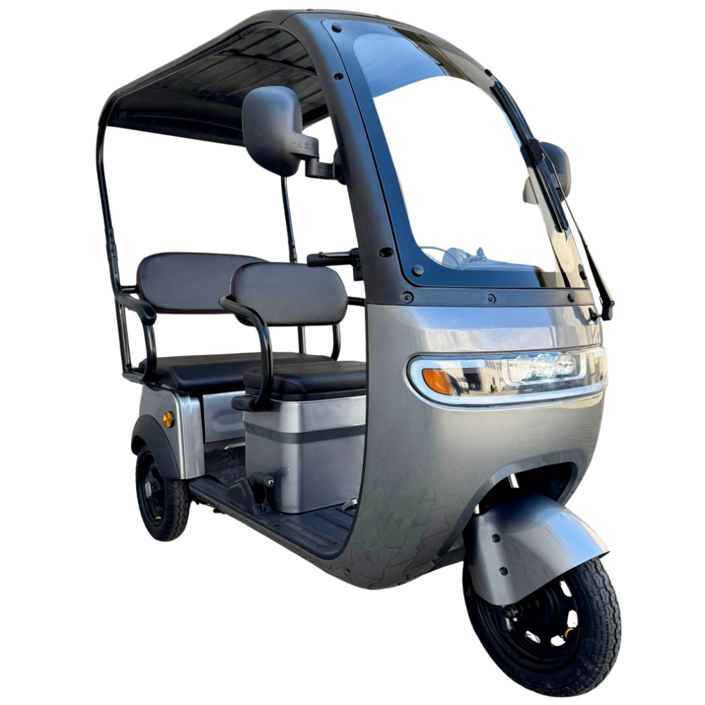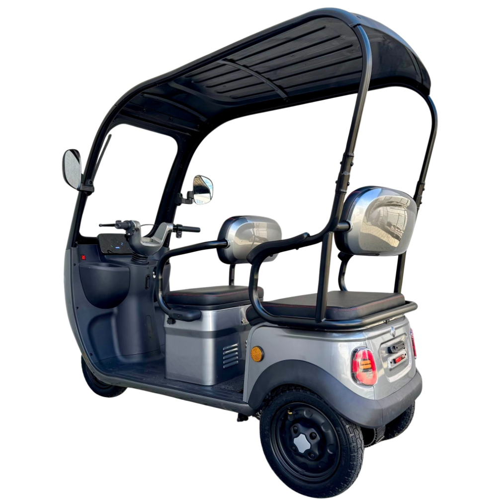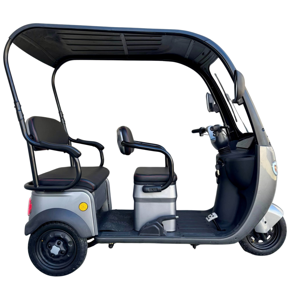 Tricicleta electrică cu 2 locuri este o soluție practică și confortabilă pentru transportul persoanelor și al diverselor bunuri, oferind stabilitate, economie și ușurință în utilizare. Cu viteză maximă de 25 km/h, nu necesită permis și poate fi folosită în siguranță în spații private sau în zone cu acces controlat. Modelul este echipat cu acoperiș și parbriz, oferind protecție împotriva vântului, ploii și soarelui, precum și multiple spații de depozitare pentru un plus de utilitate.