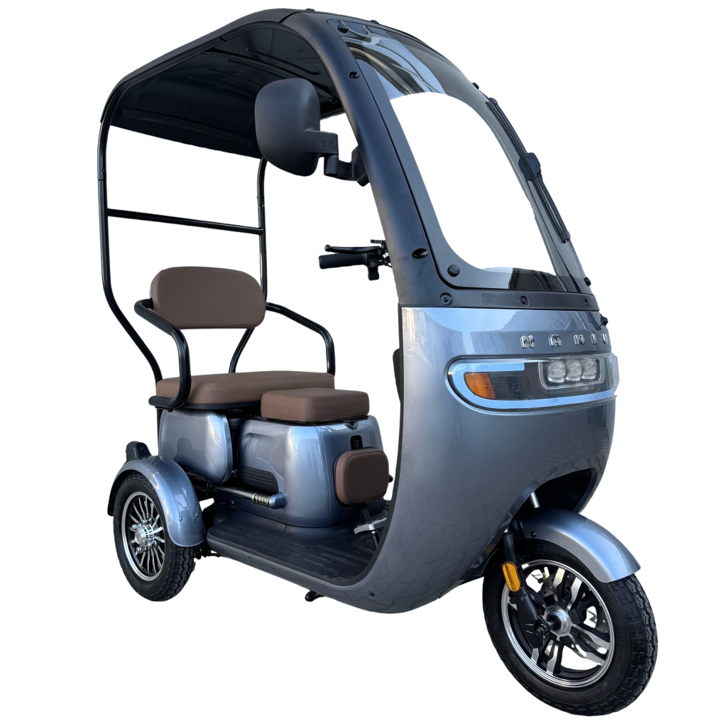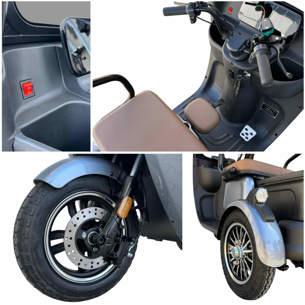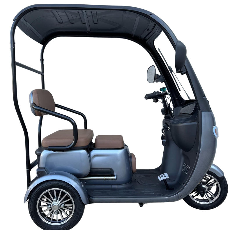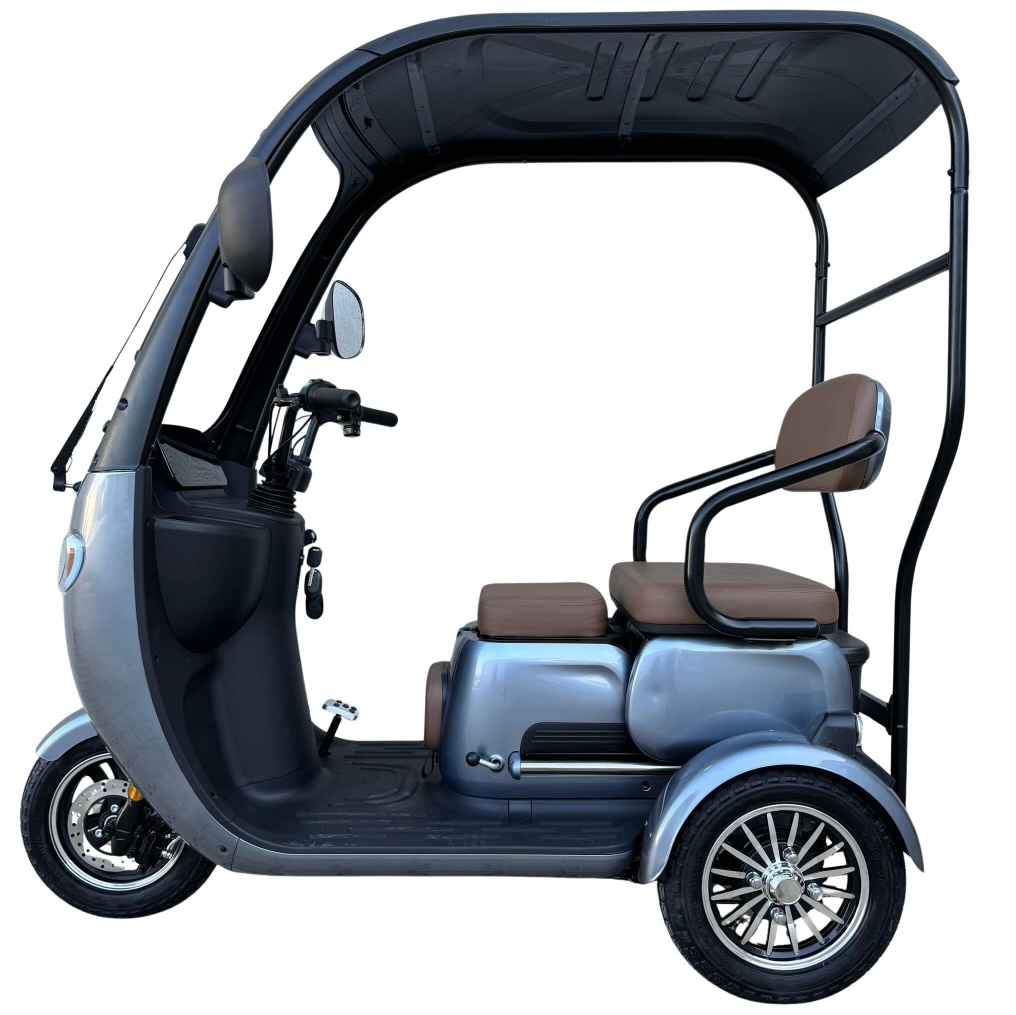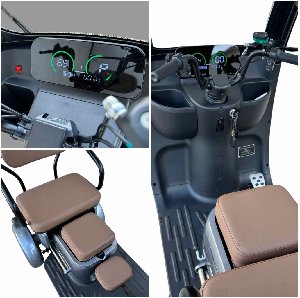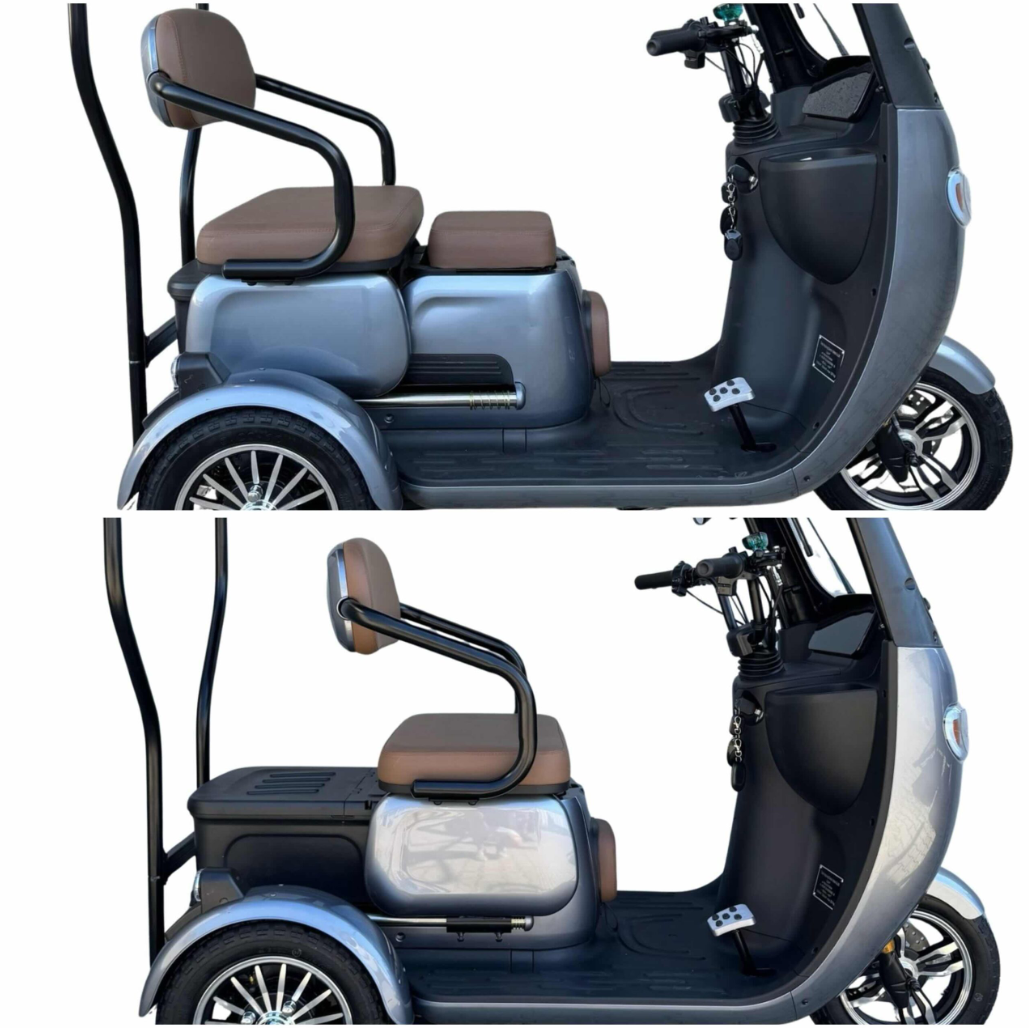 Tricicleta electrică cu 2 locuri reprezintă o soluție practică și confortabilă pentru transportul persoanelor și bunurilor în spații private. Viteza maximă de 25 km/h permite utilizarea fără permis, iar designul modern cu acoperiș și parbriz oferă protecție sporită împotriva ploii, vântului și soarelui. Modelul dispune de multiple spații de depozitare și funcții inteligente, fiind ideal pentru activități gospodărești, comerciale sau uz personal.