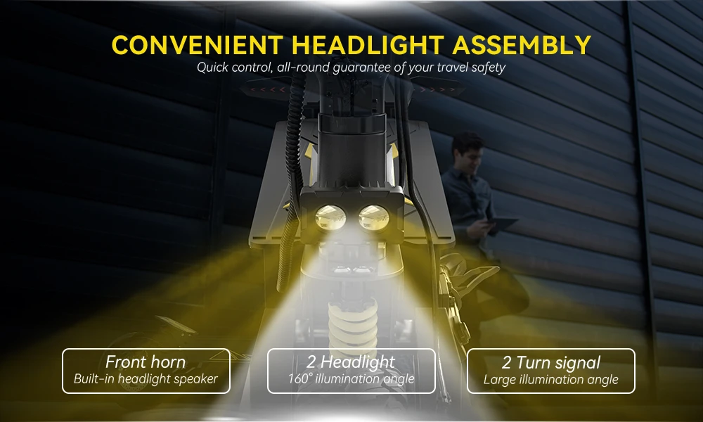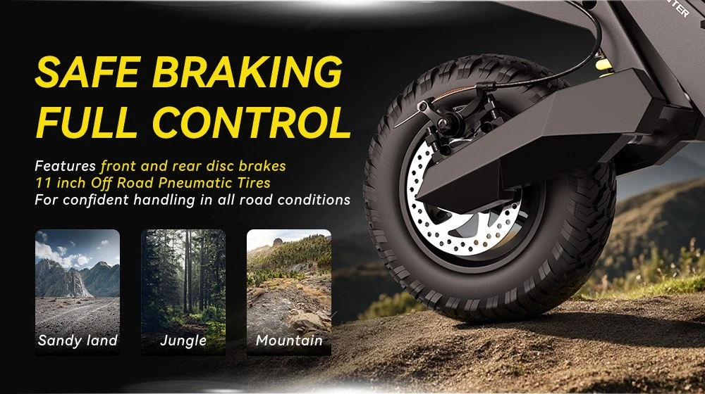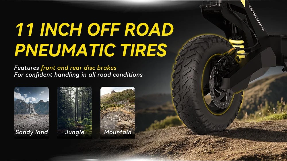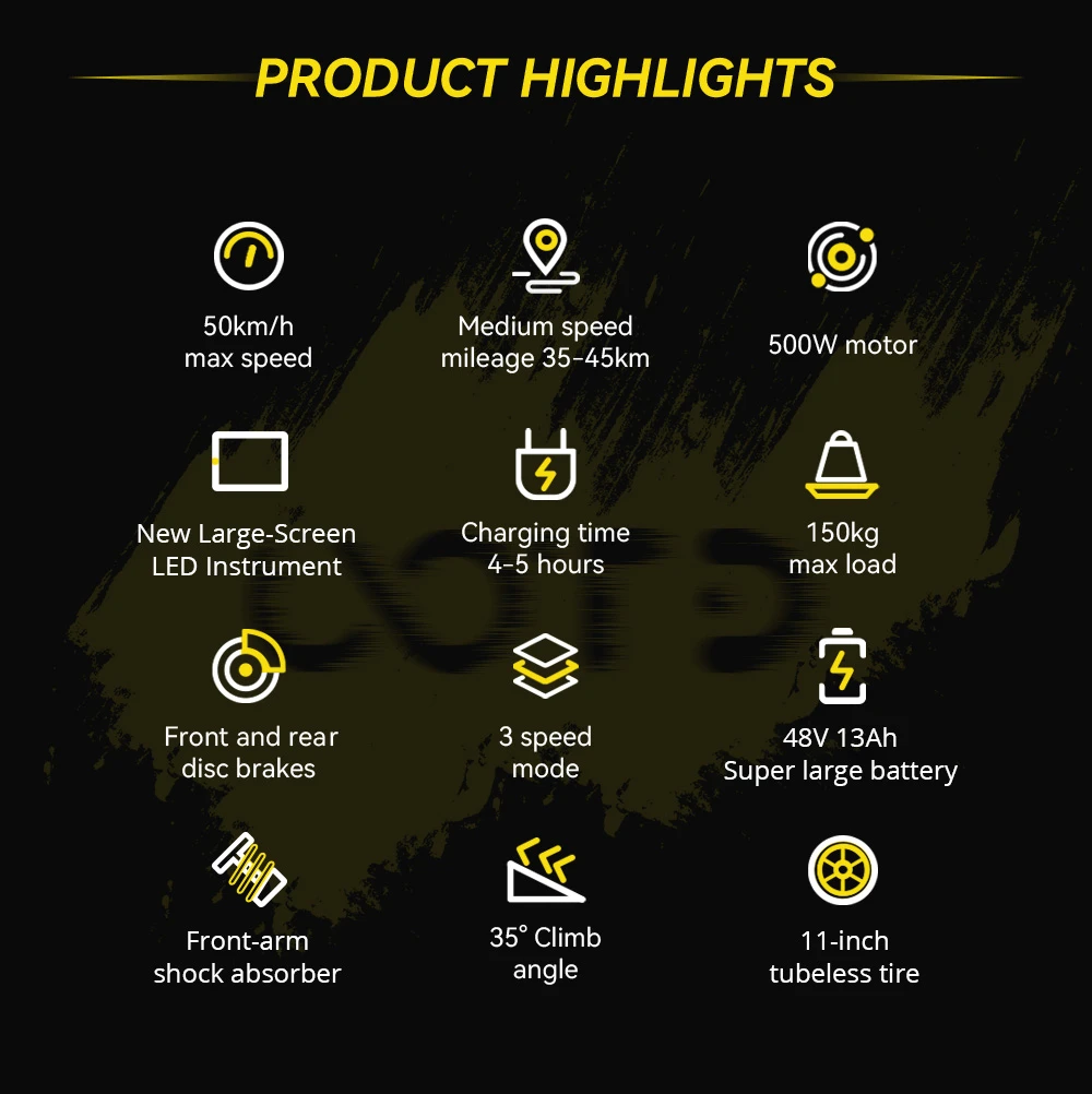 Bateria de 48V 13Ah asigură o autonomie reală de până la 45 km, iar încărcarea rapidă în 4–5 ore permite utilizarea zilnică fără pauze lungi. Anvelopele pneumatice de 11 inch, împreună cu suspensia față și spate, absorb eficient denivelările și oferă confort superior pe asfalt, pietriș sau drumuri neamenajate.