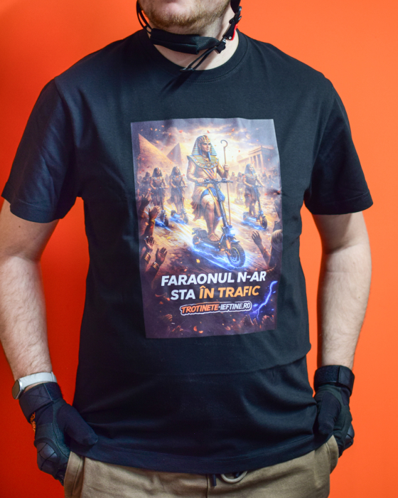 ricou negru cu design original și mesaj amuzant „Faraonul n-ar sta în trafic”, inspirat din cultura egipteană reinterpretată într-un stil modern, unde faraonul conduce o trotinetă electrică. Un design creativ dedicat celor care preferă mobilitatea rapidă și libertatea deplasării în oraș.