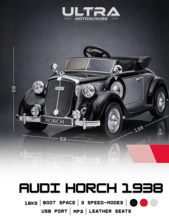 Mașinuța electrică Audi Horch 1938 este un model retro spectaculos, inspirat din celebrul automobil clasic. Designul elegant și detaliile cromate oferă un aspect premium, perfect pentru copiii care iubesc mașinile clasice.