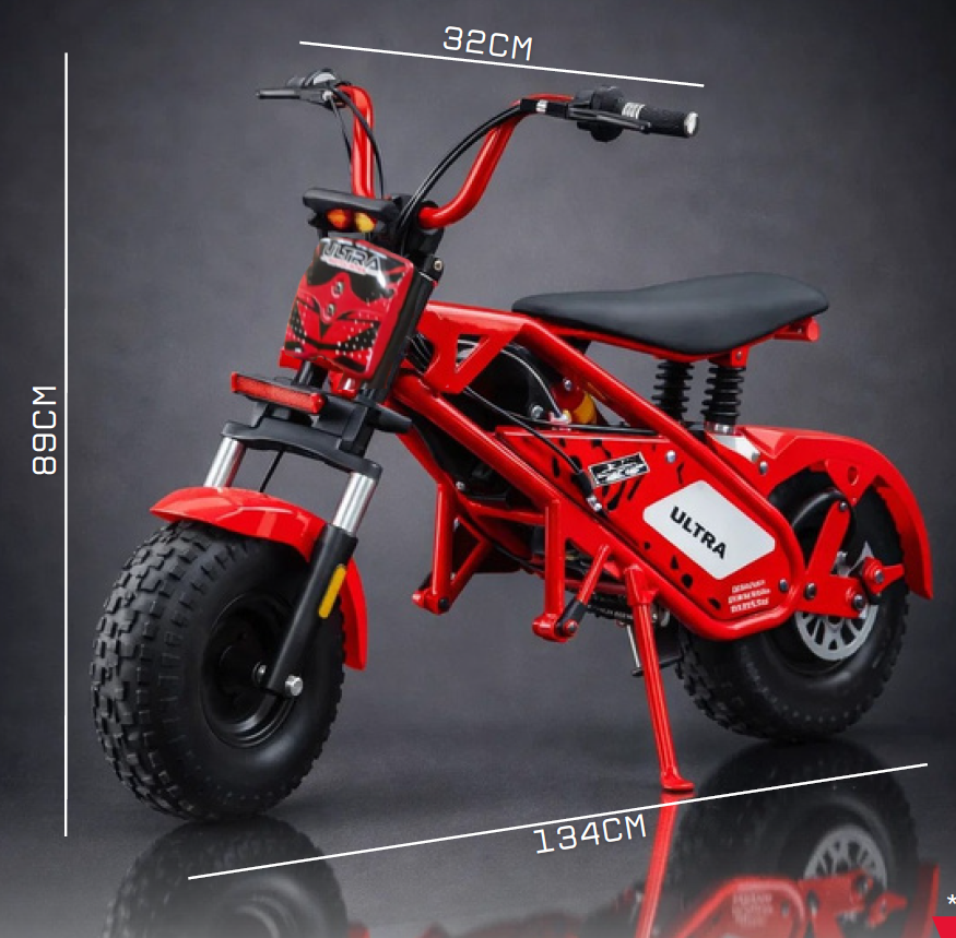 Motorul brushless de 1000W (36V) oferă accelerație puternică și constantă, permițând atingerea unei viteze de până la 40 km/h. Cuplul instant caracteristic motoarelor electrice face ca această mini motocicletă să fie extrem de plăcută pe teren accidentat, pietriș sau pământ.