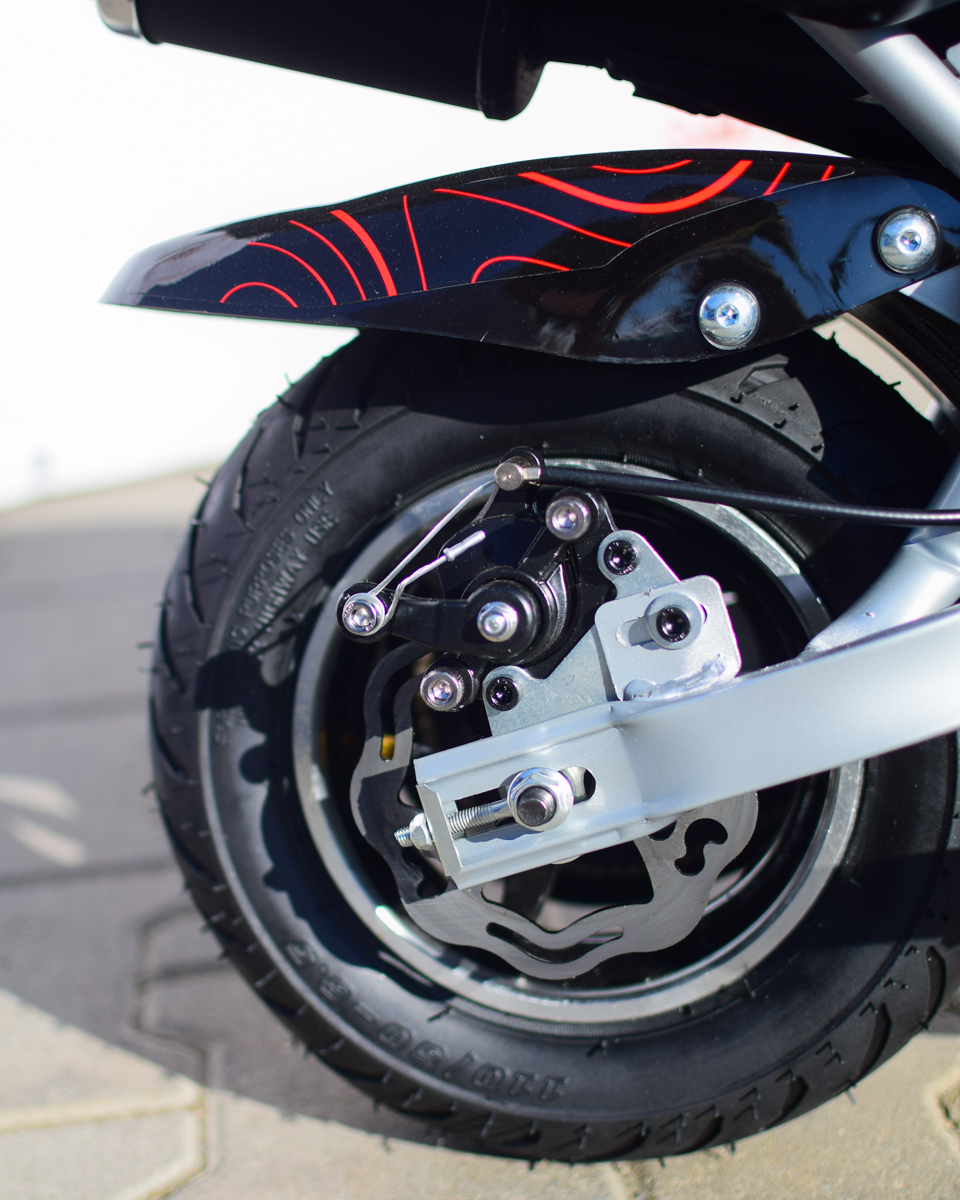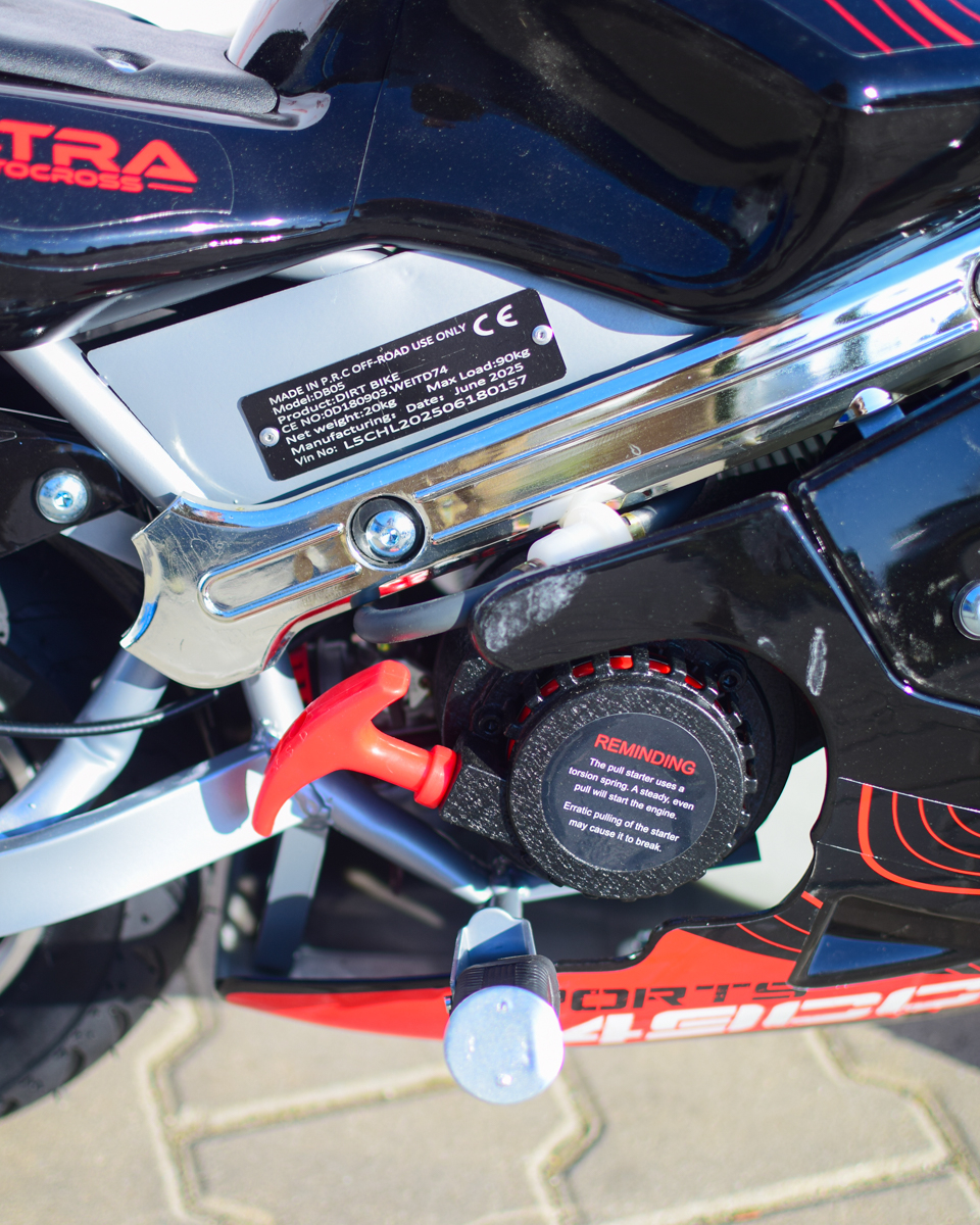 Motorul pe benzină de 49cc, în 2 timpi, dezvoltă o putere de 3.5 CP, suficientă pentru a atinge o viteză de până la 50 km/h. Pornirea se face simplu, prin sistem Pull Start, iar transmisia pe lanț asigură o accelerație rapidă și un control precis.